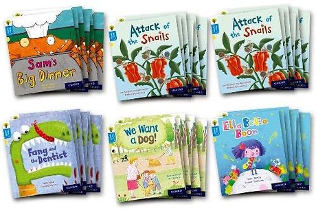 This pack contains 36 books, six of each of the following titles: Sam's Big Dinner, Thing, Attack of the Snails, Fang and the Dentist, We Want a Dog! and Ella Bella Boon.