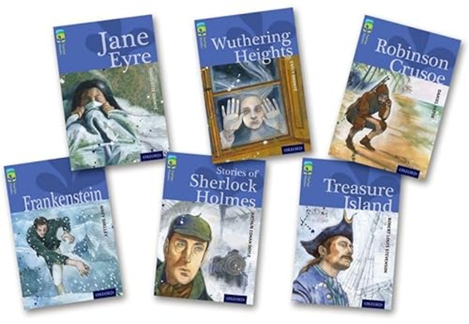 This pack contains 6 books, one of each of: Frankenstein, Jane Eyre, Stories of Sherlock Holmes, Wuthering Heights, Treasure Island, Robinson Crusoe.
