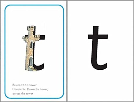 Each card has a picture on one side merged with its initial letter to teach the mnemonic. Notes are included to indicate which letter sounds and bounce sounds, and which are stretch sounds. There are also instructions on how to hand-write the letter. The back of each card shows the plain letter (or letter group).