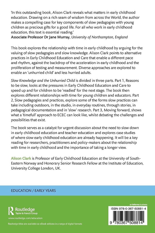 Alison Clark through this book, points to alternative practices in Early Childhood Education and Care that enable a different pace and rhythm, against the backdrop of the acceleration in early childhood and the proliferation of testing and measurement. Diverse approaches are explored to enable an ‘unhurried child’ and less hurried adults.