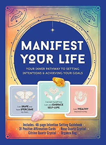 Manifest Your Life kit contains everything you need to jump start your manifestation journey including guidebook of popular manifestation techniques, 31 positive affirmation cards, and two quartz crystals.