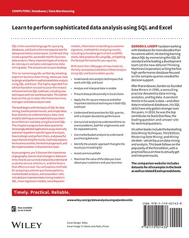 You'll learn the fundamental techniques before moving into the "where" and "why" of each analysis, and then learn how to design and perform these analyses using SQL and Excel. Examples include SQL and Excel code, and the appendix shows how non-standard constructs are implemented in other major databases, including Oracle and IBM DB2/UDB. The companion website includes datasets and Excel spreadsheets, and the book provides hints, warnings, and technical asides to help you every step of the way.