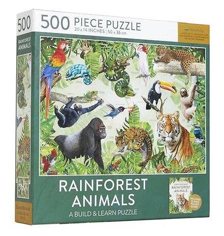From the canopy to the forest floor, discover the many rare and endangered animals from rainforests around the world with this beautiful 500-piece puzzle.