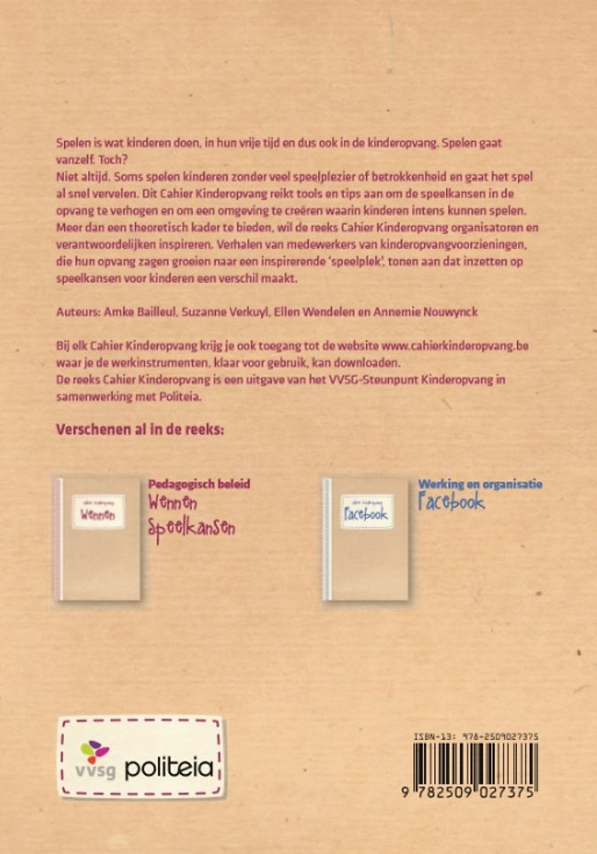Spelen is wat kinderen doen, in hun vrije tijd en dus ook in de kinderopvang. Spelen gaat vanzelf. Toch? Niet altijd. Soms spelen kinderen zonder veel speelplezier of betrokkenheid en gaat het spel al snel vervelen. Dit 'Cahier Kinderopvang' reikt tools en tips aan om de speelkansen in de opvang te verhogen en om een omgeving te creëren waarin kinderen intens kunnen spelen. Meer dan een theoretisch kader te bieden, wil de reeks 'Cahier Kinderopvang' organisatoren en verantwoordelijken inspireren. Lokale praktijken en verhalen van medewerkers die hun opvang zagen groeien tot een inspirerende ‘speelplek’, tonen aan dat inzetten op speelkansen voor kinderen een verschil maakt. De reeks 'Cahier Kinderopvang' is een uitgave van VVSG-Steunpunt Kinderopvang in samenwerking met Politeia.