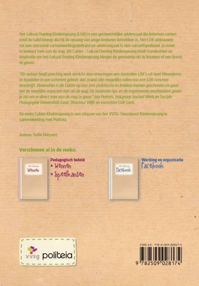 Het Lokaal Overleg Kinderopvang (LOK) is een gemeentelijke adviesraad die iedereen samen rond de tafel brengt die bij de opvang van jonge kinderen betrokken is. Het LOK uitbouwen tot een succesvol samenwerkingsverband en adviesorgaan is niet vanzelfsprekend. Men moet er bewust mee aan de slag. Dit 'Cahier – Lokaal Overleg Kinderopvang' biedt handvatten en inspiratie om het Lokaal Overleg Kinderopvang binnen de gemeente uit te bouwen of een boost te geven. “De auteur heeft prachtig werk verricht door ervaringen van tientallen LOK’s uit heel Vlaanderen te bundelen in een coherent geheel, dat zowat alle mogelijke rollen van een LOK concreet beschrijft. Bovendien is dit Cahier op een zeer praktische en heldere manier geschreven en gaat het de moeilijke aspecten niet uit de weg. De boeiende tips en de inspirerende voorbeelden geven je zin om er direct mee aan de slag te gaan.” Jan Peeters, Vakgroep Sociaal Werk en Sociale Pedagogiek Universiteit Gent, Directeur VBJK en voorzitter LOK Gent. De reeks Cahier Kinderopvang is een uitgave van het VVSG-Steunpunt Kinderopvang in samenwerking met Politeia.