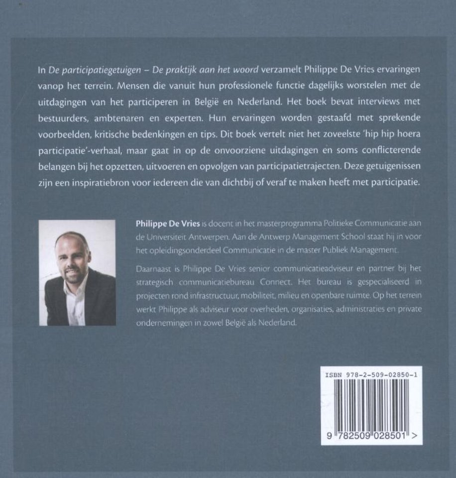 Philippe De Vries verzamelt ervaringen vanop het terrein: mensen die vanuit hun professionele functie dagelijks worstelen met de uitdagingen van het participeren in België en Nederland. Deze content bevat interviews met bestuurders, ambtenaren en experts. Hun ervaringen worden gestaafd met sprekende voorbeelden, kritische bedenkingen en tips. De content vertelt niet het zoveelste hip hip hoera participatie! verhaal, maar gaat in op de onvoorziene uitdagingen en soms conflicterende belangen bij het opzetten, uitvoeren en opvolgen van participatietrajecten. De getuigenissen zijn een inspiratiebron voor iedereen die van dichtbij of veraf te maken heeft met participatie.