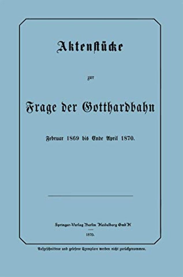Interpellation in der zweiten preußischen Kammer vom Februar 1869.- Norddeutsche Note an den Schweizerischen Bundesrath vom 31. März 1869.- Italienische Note an den Schweizerischen Bundesrath vom 31. März 1869.- Badische Note an den Schweizerischen Bundesrath vom 5. April 1869.- Württembergische Note an den Schweizerischen Bundesrath vom 23. September 1869.- Protocole Final de la conférence de Berne du 13 Octobre 1869.- Schlußprotokoll der Berner Konferenz vom 13. Oktober 1869 (Uebersetzung).- Italienisch=Schweizerischer Vertrag vom 15. Oktober 1869.- Schweizerische Note vom 29. November 1869.- Note des Bundeskanzlers Grafen Bismarck an den Oberst Hammer in Berlin vom 30. Januar 1870.- Schweizerische Depesche vom 9. März 1870.- Verhandlungen der badischen Kammern.- Verlängerung des in dem italienisch-schweizerischen Vertrage vorgesehenen Termins.