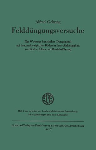 Die Grundlagen des braunschweigischen Ackerbaues in den einzelnen Produktionsgebieten.- A. Geologischer Aufbau der Produktionsgebiete und Art der vorhandenen Böden.- I. Bergland.- II. Hügelland.- III. Flachland.- IV. Gebirgsland.- V. Marschland.- B. Die klimatischen Verhältnisse.- C. Die betriebswirtschaftlichen Verhältnisse der einzelnen Produktionsgebiete.- I. Bergland.- II. Hügelland.- III. Flachland.- IV. Gebirgsland.- V. Marschland.- Die Wirkung der verschiedenartigen Düngemittel in den verschiedenen Produktionsgebieten der braunschweigischen Landwirtschaft.- I. Bergland.- A. Kalkversuche.- B. Kaliversuche.- C. Phosphorsäureversuche.- D. Stickstoffversuche.- II. Hügelland.- A. Kalkversuche.- B. Kaliversuche.- C. Phosphorsäureversuche.- D. Stickstoffversuche.- III. Flachland.- A. Kalkversuche.- B. Kaliversuche.- C. Phosphorsäureversuche.- D. Stickstoffversuche.- IV. Gebirgsland.- A. Kalkversuche.- B. Kaliversuche.- C. Phosphorsäureversuche.- D. Stickstoffversuche.- V. Marschland.- Zusammenfassung.- Kalkversuche.- Kaliversuche.- Phosphorsäureversuche.- Stickstoffversuche.- Schluß.- Klimakarte des Landes Braunschweig.