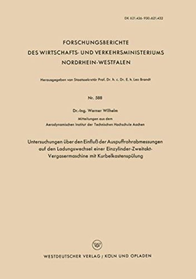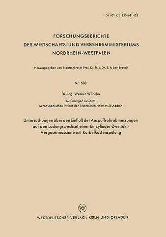 Diese Arbeit stellt einen Teil der Untersuchungen über die Strömungs vorgänge in pulsierend arbeitenden Triebwerken dar, die am Aerodynami schen Institut der Rheinisch-Westfälischen Technischen Hochschule Aachen durchgeführt werden. Dem Leiter des Insti.tutes, Herrn Prof. Dr.-Ing. F. SEEWALD, bin ich für wissenschaftliche Förderung zu stetem Dank verpflichtet. Ebenfalls schulde ich Herrn Dr.-Ing. H. ZELLER für Unterstützungen und Hinweise Dank. Für experimentelle Untersützung und Hilfen sowie für das Zeichnen der bildlichen Darstellungen sei an dieser Stelle den Herren Dipl.-Ing. K. STÜLPNER, Dipl.-Ing. F. LANGEN und Dipl.-Ing. R. JÜRGLER gedankt. Seite 5 Forsohungsberiohte des Wirtsobafts- und Verkehrsministeriums Nordrbein-Westfalen 1. Einleitung Es ist bekannt, daß infolge des intermittierenden Auspuffvorganges am Zweitaktmotor Gasschwingungen in den Auspuffrohren angeregt werden, die starke Rückwirkungen auf den Ladungswechsel der Maschine, also auf das Einbringen von Frischladung und Entfernen der verbrannten Ladung ausüben, so daß die Leistung und die übrigen Kennfeldgrößen der Maschine, wie Brennstoffverbrauch, Luftaufwand, Abgastemperatur ~d Kurbelkastentem peratur entscheidend beeinflußt werden können.