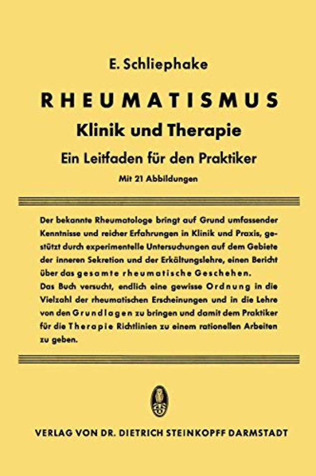 I. Allgemeine Pathogenese des Rheumatismus.- Begriff des Rheumatismus.- Bedeutung der rheumatischen Krankheiten für die Allgemeinheit.- Endokrinium und Rheumatismus.- Der infektiöse Faktor.- Erkältung und Rheumatismus.- Die Formen des Rheumatismus.- Gelenkrheumatismus.- Nerven-, Muskel-, tendoperiostitischer Rheumatismus.- II. Prophylaxe.- III. Allgemeine Therapie.- Infektbehandlung.- Arzneibehandlung, Chemotherapie.- Hormonbehandlung.- Physikalische Therapie.- Grundlagen der Massagebehandlung.- Wärme- und Kältebehandlung.- Behandlung mit allgemeiner Überwärmung.- Ultraschall.- Ultrakurzwellen. Elektrische Hyperthermie.- Elektrische Erwärmung, Unterkühlung.- Injektionsbehandlung (Heilanästhesie).- Behandlung in Bädern und Kurorten.- IV. Spezieller Teil.- Polyarthritiden.- Polyarthritis acuta (akuter Gelenkrheumatismus).- Subakute Polyarthritis.- Sekundär chronische Polyarthritis.- Rheumatoide.- Das Still-, Felty- und Reiter-Syndrom.- Primär chronische Polyarthritis.- Arthritis sicca (deformans).- Rheumatische Einzelbilder.- Rheumatisdie Kopfschmerzen.- Obere Extremität.- Schultergürtel, Arm.- Rumpf, Rüdcen.- Arthropathien der Wirbelsäule.- Untere Extremität.- Das Isdiias-Syndrom.- Bandscheibenprolaps.- Therapie bei Ischias.- Hüftgelenke.- Knie, Fuß.- V. Anhang: Differentialdiagnostisch wichtige Osteopathien.- Abbildungen.- Schrifttum.- Autorenregister.