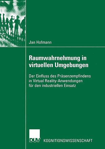 1 Einführung.- 1.1 Grundbegriffe von Virtual Reality.- 1.2 Problemstellung und Stand der Forschung.- 1.3 Ziel der Arbeit und Vorgehen.- 2 Präsenz in virtuellen Umgebungen.- 2.1 Theoretische Konzeption.- 2.2 Messung von Präsenz.- 2.3 Beeinflussung von Präsenz.- 2.4 Auswirkungen von Präsenz.- 2.5 Zusammenfassung.- 3 Visuelle Raumwahrnehmung.- 3.1 Das visuelle rezeptorische System.- 3.2 Psychophysik der visuellen Raumwahrnehmung.- 3.3 Empirische Methoden und Ergebnisse.- 3.4 Zusammenfassung.- 4 Versuchskonzeption und Durchführung.- 4.1 Grundstruktur der Versuche.- 4.2 Versuchspersonen.- 4.3 Auswahl kontrollierbarer präsenzbeeinflussender Faktoren.- 4.4 Versuchsaufbau.- 4.5 Modifikation des Präsenzfragebogens.- 4.6 Versuchsablauf.- 4.7 Datenanalyse.- 4.8 Zusammenfassung.- 5 Versuchsergebnisse und Diskussion.- 5.1 Kurzfassung der Auswertung.- 5.2 Größenwahrnehmung virtueller Objekte: Der Einfluss der Bildaufbaurate.- 5.3 Präsenz der Nutzer: Der Einfluss von Immersion und Realitätsnähe.- 5.4 Raumwahrnehmung im virtuellen Cockpit: Der Einfluss von Immersion und Realitätsnähe.- 5.5 Raumwahrnehmung im virtuellen Cockpit: Der Einfluss der Präsenz.- 5.6 Implikationen und Ausblick.- Zusammenfassung.- Literatur.- A Kontrollierbare präsenzbeeinflussende Faktoren.- B Präsenzfragebogen.- C Abschlussfragebogen.- D Versuchspersonenstatistik.- E Technische Daten des VR-Systemes.- F Details der Kalibrierung und Rohdatenverarbeitung.- G Details des Versuchsablaufes.- H Details der statistischen Auswertungen.- I Details der Effekte von Immersion und Realitätsnähe auf die Präsenz.- J Details der Korrektur der Fokussierungsentfernung.