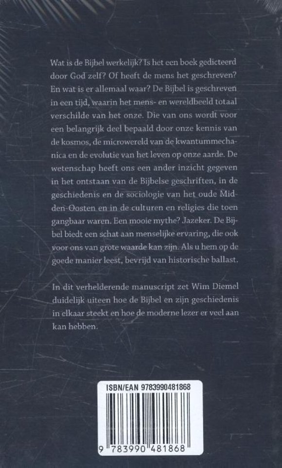 Wim Diemel zet in dit verhelderende boek uiteen hoe de Bijbel en zijn geschiedenis in elkaar steekt. Hij neemt de lezer mee in de geschiedenis en naar het ontstaan van de Bijbel. Door God gedicteerd? En wat is historisch waar? Hoe zit het precies met Jezus, is het echt allemaal zo gegaan? De geschiedenis blijkt een heel andere te zijn. Heeft de Bijbel dan helemaal afgedaan? Natuurlijk niet. De prachtige gedachten en verhalen zijn een schat aan mensenkennis en levenservaring. Alleen vergt het een andere kijk: de Bijbel als mythe.