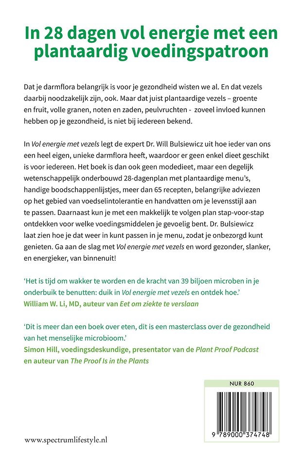 Dat je darmflora belangrijk is voor je gezondheid wisten we al. En dat vezels noodzakelijk zijn, ook. Maar dat juist plantaardige vezels - groente en fruit, volle granen, noten en zaden, peulvruchten - zoveel invloed kunnen hebben op je gezondheid is niet bij iedereen bekend. In Vol energie met vezels legt de expert Dr. Will Bulsiewicz - voormalig liefhebber van junkfood - uit hoe ieder van ons een heel eigen, unieke darmflora heeft, waardoor er geen enkel dieet geschikt is voor iedereen. Het boek is dan ook geen modedieet, maar een degelijk wetenschappelijk onderbouwd 28-dagenplan met plantaardige menu's, handige boodschappenlijstjes, meer dan 65 recepten, belangrijke adviezen op het gebied van voedselintolerantie en handvatten om je levensstijl aan te passen. Daarnaast kun je met een makkelijk te volgen plan stap-voor-stap ontdekken voor welke voedingsmiddelen je gevoelig bent. Dr. Bulsiewicz laat zien hoe je dat weer in kunt passsen in je menu, zodat je onbezorgd kunt genieten.