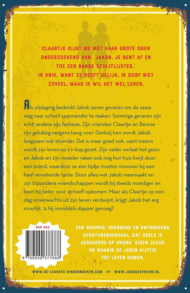 Op weg naar school moet Jakob elke dag zeven gevaren trotseren. Die gevaarlijke Duitse herder bij mandenwinkel Bruins bijvoorbeeld. Het kerkhof. En Jakobs strenge meester Hoeben. Jakobs vriendin Claartje vindt hem eigenlijk een angsthaas. Maar die gevaren onderweg zijn nog niet eens Jakobs grootste zorg! Zijn vader heeft het gezin verlaten en dan raken Jakob en zijn moeder ook nog het huis kwijt door een brand, waardoor ze voor een tijdje moeten inwonen bij een heel vervelende tante. Door alles wat Jakob meemaakt en zijn bijzondere vriendschappen wordt hij steeds moediger en leert hij beter voor zichzelf opkomen. Tot hij op een dag naar school loopt en wél raad met alle gevaren weet.