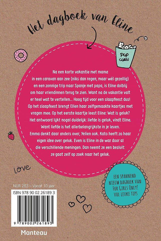 Na een korte vakantie met mama in een caravan aan zee (niks dan regen, maar wél gezellig) en een zonnige trip naar Spanje met papa, is Eline dolblij om haar vriendinnen terug te zien. Want na de vakantie valt er heel wat te vertellen... Hoog tijd voor een slaapfeest dus! Op het slaapfeest brengt Ellen haar zelfgemaakte kaartjes met vragen mee. Op het eerste kaartje leest Eline: Wat is geluk? Het antwoord lijkt nogal duidelijk: liefde is geluk, vindt Eline. Want liefde is het allerbelangrijkste in je leven. Emma denkt daar anders over, Yelien ook. Kato heeft zo haar eigen mening over geluk. Even is Eline in de war door al die verschillende meningen. Dan neemt ze een besluit: ze gaat zelf op zoek naar het geluk.