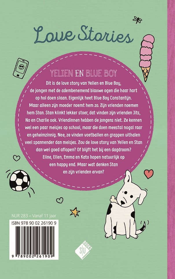 Dit is de love story van Yelien en Blue Boy, de jongen met de adembenemend blauwe ogen die haar hart op hol doen slaan. Eigenlijk heet Blue Boy Constantijn. Maar alleen zijn moeder noemt hem zo. Zijn vrienden noemen hem Stan. Stan klinkt lekker stoer, dat vinden zijn vrienden Jits, No en Charlie ook. Vriendinnen hebben de jongens niet. Ze kennen wel een paar meisjes op school, maar die doen meestal nogal raar en geheimzinnig. Nee, ze vinden voetballen en grappen uithalen veel spannender dan meisjes. Zou de love story van Yelien en Stan dan wel goed aflopen? Of blijft het bij een dagdroom? Eline, Ellen, Emma en Kato hopen natuurlijk op een happy end. Maar wat denken Stan en zijn vrienden ervan?