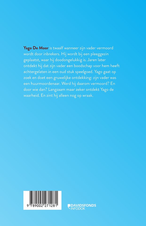 Yago De Moor is twaalf wanneer zijn vader vermoord wordt door inbrekers. Hij wordt bij een pleeggezin geplaatst, waar hij doodongelukkig is. Jaren later ontdekt hij dat zijn vader een boodschap voor hem heeft achtergelaten in een oud stuk speelgoed. Yago gaat op zoek en doet een gruwelijke ontdekking: zijn vader was een huurmoordenaar. Werd hij daarom vermoord? En door wie dan? Langzaam maar zeker ontdekt Yago de waarheid. En zint hij alleen nog op wraak.