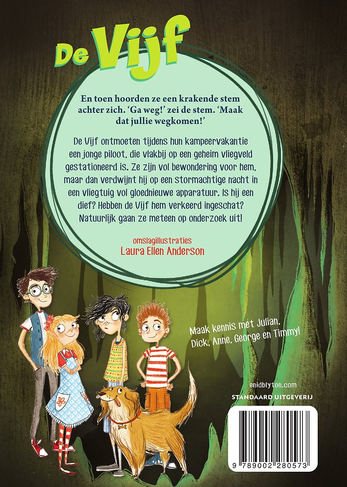 De Vijf ontmoeten tijdens hun kampeervakantie een jonge piloot, die vlakbij op een geheim vliegveld gestationeerd is. Ze zijn vol bewondering voor hem, maar dan verdwijnt hij op een stormachtige nacht in een vliegtuig vol gloednieuwe apparatuur. Is hij een dief? Hebben de Vijf hem verkeerd ingeschat? Natuurlijk gaan ze meteen op onderzoek uit!