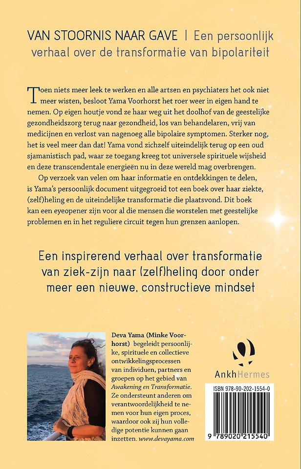 In Van stoornis naar gave vertelt Yama Voorhorst het persoonlijke verhaal over de heling van haar bipolaire stoornis. Toen niets meer leek te werken - en alle artsen en hulpverleners het ook niet meer wisten - besloot ze het heft in eigen handen te nemen. Ze vond haar weg terug uit het doolhof van de GGZ naar gezondheid; los van behandelaren, vrij van medicijnen en verlost van nagenoeg al haar bipolaire symptomen. Dit boek kan een absolute eye-opener zijn voor al die mensen die worstelen met geestelijke problemen en in het reguliere circuit tegen hun grenzen aanlopen. Yama's verhaal is inspirerend omdat het laat zien hoe zij transformeerde van ziek-zijn naar (zelf)heling door onder meer rust, voeding en meditatie.