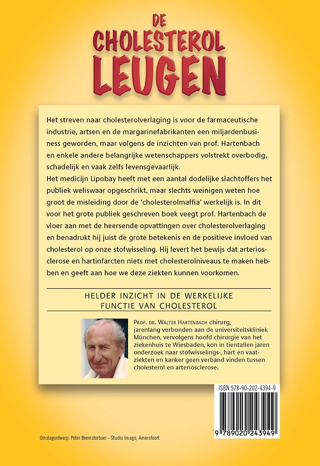 Het medicijn Lipobay heeft met een aantal dodelijke slachtoffers het publiek weliswaar opgeschrikt, maar slechts weinigen weten hoe groot de misleiding door de 'cholesterolmaffia' werkelijk is. In 'De cholesterol-leugen' veegt prof. Hartenbach de vloer aan met de heersende opvattingen over cholesterolverlaging en benadrukt hij juist de grote betekenis en de positieve invloed van cholesterol op onze stofwisseling. Hij levert het bewijs dat arterio-sclerose en hartinfarcten niets met cholesterolniveaus te maken hebben en geeft aan hoe we deze ziekten kunnen voorkomen.