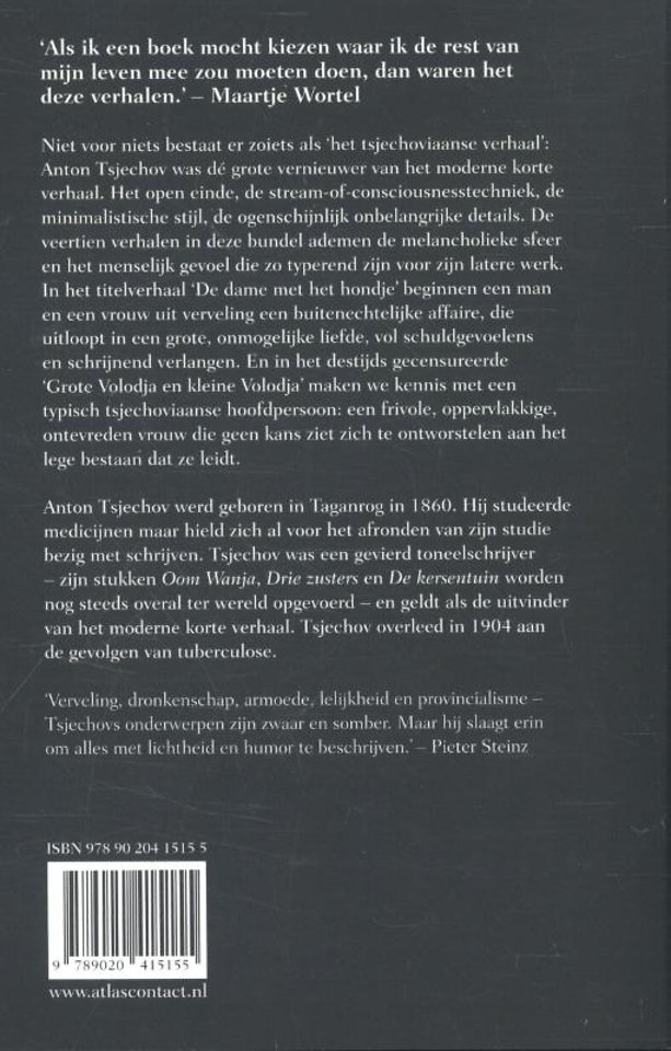 Niet voor niets bestaat er zoiets als ‘het Tsjechoviaanse verhaal’: Anton Tsjechov was dé grote vernieuwer van het moderne korte verhaal. Het open einde, de stream-of-consciousness techniek, de minimalistische stijl, de ogenschijnlijk onbelangrijke details: veel kenmerken uit de verhalen van latere grootmeesters zoals Hemingway, Joyce en Faulkner zijn uitgevonden door Tsjechov. Vooral in de laatste jaren van zijn leven schreef Tsjechov een aantal verhalen die tot zijn meesterwerken worden gerekend. De veertien verhalen in deze bundel ademen de melancholieke sfeer en het menselijk gevoel die zo typerend is voor dit latere werk. In het titelverhaal ‘De dame met het hondje’ beginnen een man en een vrouw uit verveling een buitenechtelijke affaire die uitloopt in een grote, onmogelijke liefde, vol schuldgevoelens en schrijnend verlangen. En in het destijds gecensureerde ‘Grote Volodja en kleine Volodja’ maken we kennis met een typisch Tsjechoviaanse hoofdpersoon: een frivole, oppervlakkige, ontevreden vrouw die geen kans ziet zich te ontworstelen aan het lege bestaan dat ze leidt.