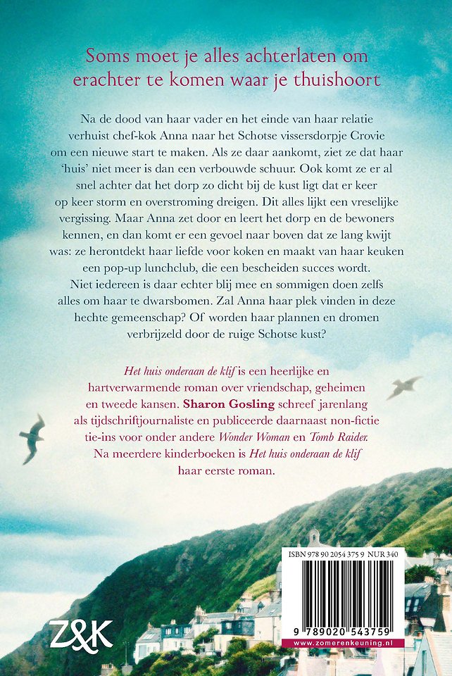 In 'Het huis onderaan de klif' van Sharon Gosling is chef Anna na een verbroken relatie van twintig jaar toe aan een nieuwe start. Ze verhuist naar Crovie, een klein vissersdorpje aan de oostkust van Schotland, maar eigenlijk heeft ze meteen spijt. Zodra ze het dorp en de mensen beter leert kennen, vindt ze ook zichzelf en haar liefde voor koken weer terug. Ze besluit haar keuken om te toveren in een kleine lunchclub. Haar leven lijkt eindelijk weer de goede kant op te gaan, zolang niets haar nieuwgevonden geluk verpest… 'Het huis onderaan de klif' is een heerlijke romance om bij weg te dromen. Voor de lezers van Katie Fforde en Santa Montefiore.