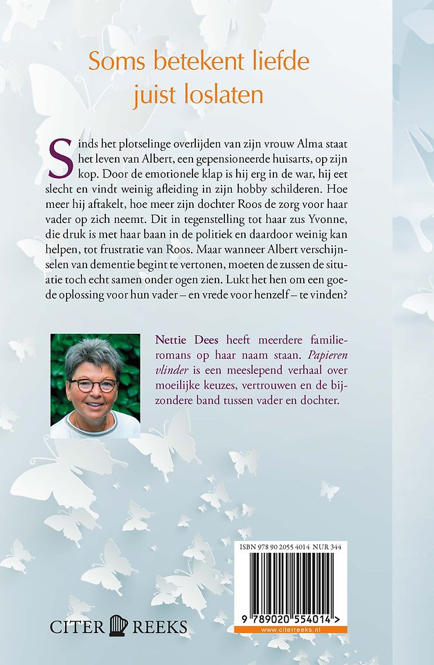 ‘Papieren vlinder’ van Nettie Dees is een familieroman over moeilijke keuzes, leren vertrouwen en de relatie tussen ouder en kind. Elke woensdag is de 53-jarige Roos bij haar vader te vinden. Sinds het overlijden van zijn vrouw zijn zijn dagen leeg, en door de emotionele klap is hij in de war. Roos zou de mantelzorg voor haar vader graag delen met haar zus Yvonne, maar die is druk met haar baan in de politiek. Toch moeten de zussen de situatie samen onder ogen zien en naar oplossingen zoeken, en dat valt niet mee!