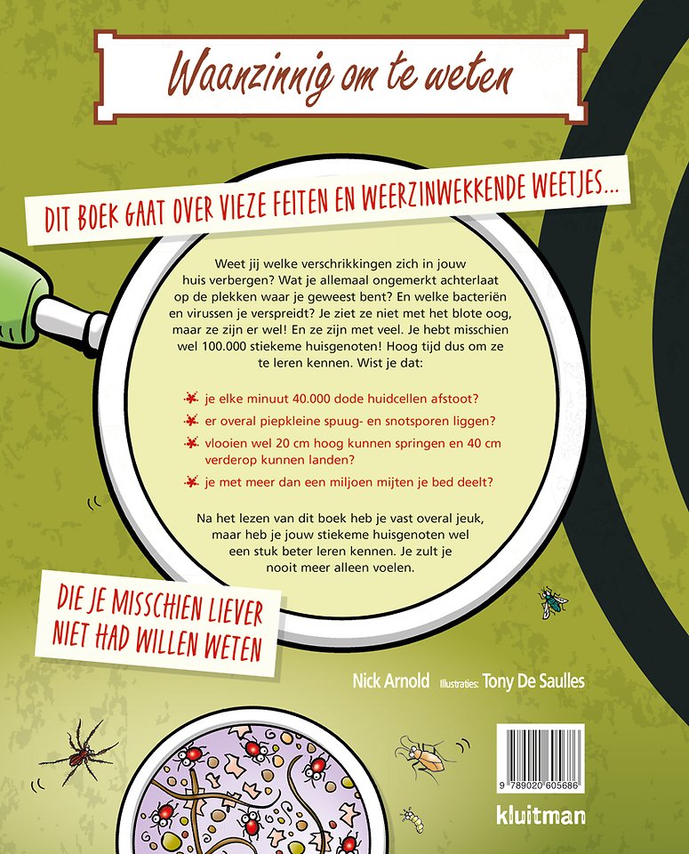 Weet jij welke verschrikkingen zich in jouw huis verbergen? Wat je allemaal ongemerkt achterlaat op de plekken waar je geweest bent? En welke bacteriën en virussen je verspreidt? Je ziet ze niet met het blote oog, maar ze zijn er wel! En ze zijn met veel. Je hebt misschien wel 100.000 stiekeme huisgenoten! Hoog tijd dus om ze te leren kennen. Wist je bijvoorbeeld dat je elke minuut 40.000 dode huidcellen afstoot? Dat er overal piepkleine spuug- en snotsporen liggen? Dat vlooien wel 20 cm hoog kunnen springen en 40 cm verderop kunnen landen? En dat je met meer dan een miljoen mijten je bed deelt?