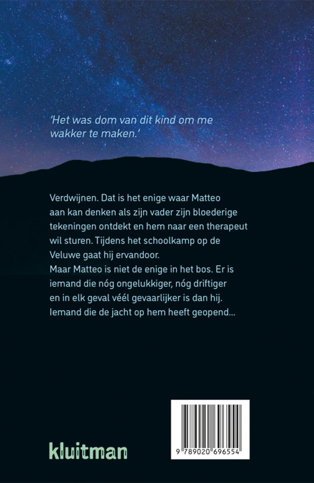 Verdwijnen. Dat is het enige waar Matteo aan kan denken als zijn vader zijn bloederige tekeningen ontdekt en hem naar een therapeut wil sturen. Tijdens het schoolkamp op de Veluwe gaat hij ervandoor.
