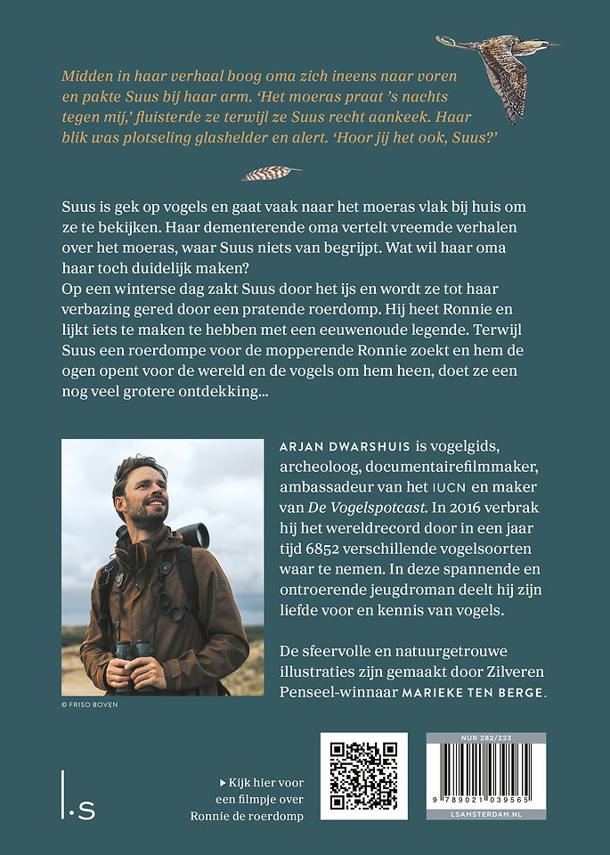 Arjan Dwarshuis, enthousiaste vogelaar en bekend van De Vogelspotcast, schreef een spannende jeugdroman over een jong meisje en een roerdomp. Met schitterende fullcolourillustraties van Zilveren Penseel-winnaar Marieke ten Berge.