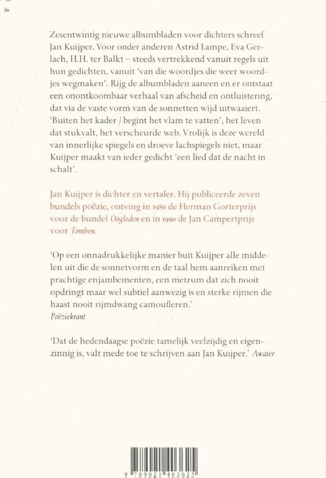Zesentwintig nieuwe albumbladen voor dichters schreef Jan Kuijper. Voor onder anderen Astrid Lampe, Eva Gerlach, H.H. ter Balkt - steeds vertrekkend vanuit regels uit hun gedichten, vanuit 'van die woordjes die weer woordjes wegmaken'. Rijg de albumbladen aaneen en er ontstaat een onontkoombaar verhaal van afscheid en ontluistering, dat via de vaste vorm van de sonnetten wijd uitwaaiert. 'Buiten het kader / begint het vlam te vatten', het leven dat stukvalt, het verscheurde web. Vrolijk is deze wereld van innerlijke spiegels en droeve lachspiegels niet, maar Kuijper maakt van ieder gedicht 'een lied dat de nacht in schalt'.