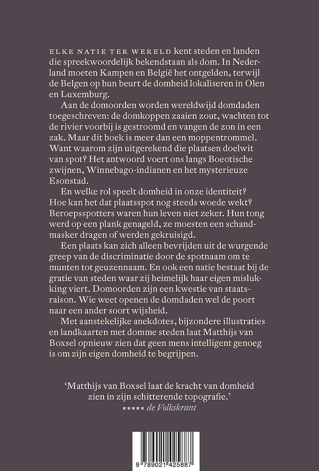 Een plaats kan zich alleen bevrijden uit de wurgende greep van de discriminatie door de spotnaam om te munten tot geuzennaam. En ook een natie bestaat bij de gratie van steden waar zij heimelijk haar eigen mislukking viert. Domoorden zijn een kwestie van staatsraison. Wie weet openen de domdaden wel de poort naar een ander soort wijsheid.