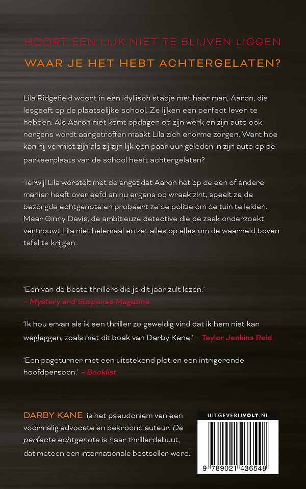 Lila Ridgefield woont in een idyllisch stadje met haar man, Aaron, die lesgeeft op de plaatselijke school. Ze lijken een perfect leven te hebben. Als Aaron niet komt opdagen op zijn werk en zijn auto ook nergens wordt aangetroffen maakt Lila zich enorme zorgen. Want hoe kan hij vermist zijn als zij zijn lijk een paar uur geleden in zijn auto op de parkeerplaats van de school heeft achtergelaten?