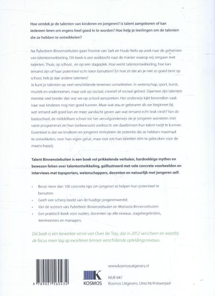 Talent binnenstebuiten van jongerenspecialisten Huub Nelis en Yvonne van Sark is hét boek over het stimuleren en ontdekken van talenten bij kinderen en jongeren tussen de 10 en 25 jaar. Steeds meer ouders en docenten worstelen met de vraag hoe je omgaat met de talenten van kinderen en jongeren. Hoe ontdek je wat echt bij iemand past? En hoe zorg je er vervolgens voor dat iemands talenten ook ontwikkelen?