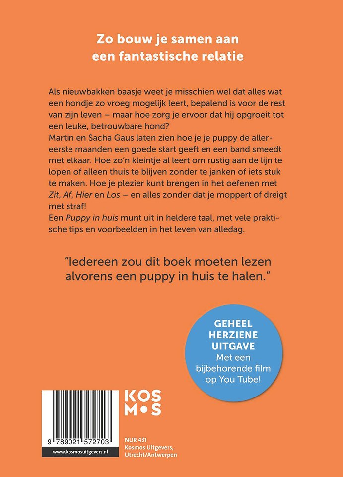 In ‘Een puppy in huis’ van Martin en Sacha Gaus staat alles wat ieder hondenbaasje moet weten over de opvoeding van een hond. Hoe leer je een puppy om buiten te plassen of om alleen thuis te blijven? En hoe kunnen kinderen veilig met de hond spelen? Met de beproefde methode in dit boek leer je hoe je de beste relatie met je pup kunt opbouwen, zodat hij goed luistert.
