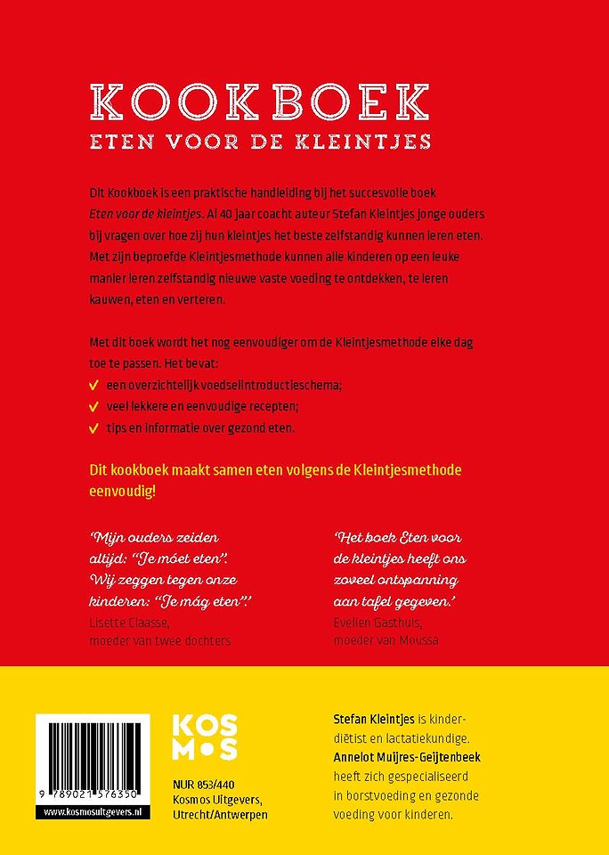 Het Kookboek Eten voor de kleintjes van Stefan Kleintjes en Annelot Muijres-Geijtenbeek biedt makkelijke en snelle recepten om baby’s vanaf 6 maanden zelf te leren eten. Dit boek sluit naadloos aan op de succesvolle Kleintjesmethode. Stefan Kleintjes, bedenker van de gelijknamige methode, verzamelde samen met Annelot Muijres-Geijtenbeek de lekkerste recepten om je baby hele stukken groente en fruit te laten eten in plaats van gepureerd voedsel. Ontdek samen met je kleintje hoe leuk en gezond het is om hem of haar zelf te leren eten!