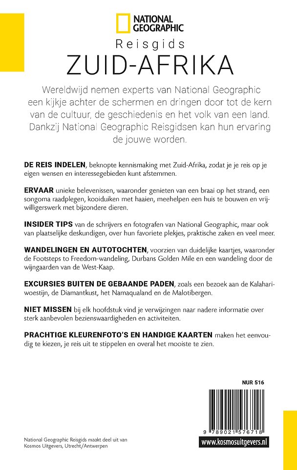 National Geographic Reisgids Zuid-Afrika is een exclusieve gids met sublieme fotografie die u meeneemt naar de bekende en minder bekende bezienswaardigheden. De experts van National Geographic nemen een kijkje achter de schermen en dringen door tot de kern van de cultuur, de geschiedenis en het volk van het land. Bezoek met deze National Geographic Reisgids Zuid-Afrika de Kalahariwoestijn, de Diamantkust, het Namaqualand en de Malotibergen. Geniet van een braai op het strand, raadpleeg een Songoma of maak een kooiduik met haaien. Of ervaar de Freedom-wandeling, Durbans Golden Mile en een wandeling door de wijnvelden van de West-kaap. De uitgebreide kennismaking met Zuid-Afrika, het overzicht met belevenissen die je niet mag missen, de insider tips, de excursies buiten de gebaande paden en de reiswijzer met hotels en restaurants en de handige kaarten maken de gids compleet. Speciaal aanbevolen voor natuur- en cultuurliefhebbers!