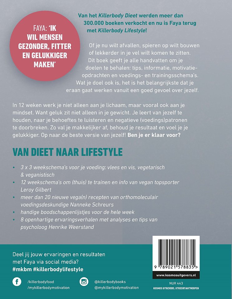 Killerbody Lifestyle van Fajah ‘Faya’ Lourens is een volledige herziene editie van haar bestseller Killerbody Dieet (300.000 boeken verkocht). Mensen die een dieet volgen hebben vaak moeite met slank en fit te blijven (jojo-effect) of zitten ook na het behalen van hun doel niet lekker in hun vel. Faya leert je dat mindset misschien nog wel belangrijker is dan voeding en beweging.