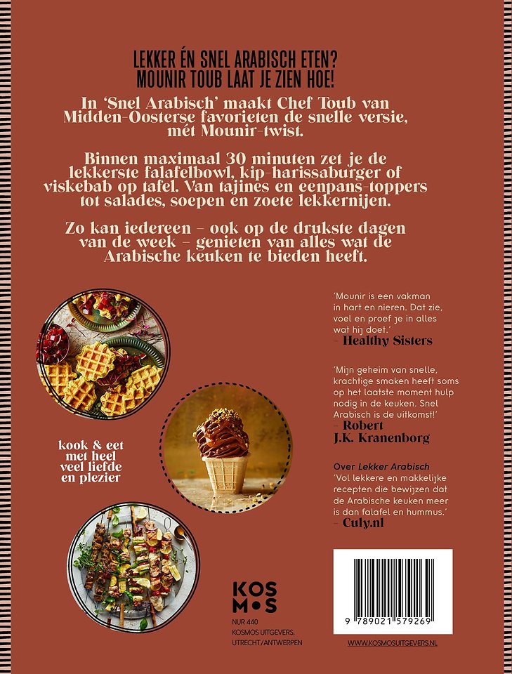 Goed nieuws voor alle fans van Lekker Arabisch: in opvolger Snel Arabisch maakt Chef Toub van Midden-Oosterse favorieten de snelle versie, mét Mounir-twist. Met de recepten uit dit toegankelijke familiekookboek zet je binnen maximaal 30 minuten de lekkerste falafelbowl, kip-harissaburger of viskebab op tafel.