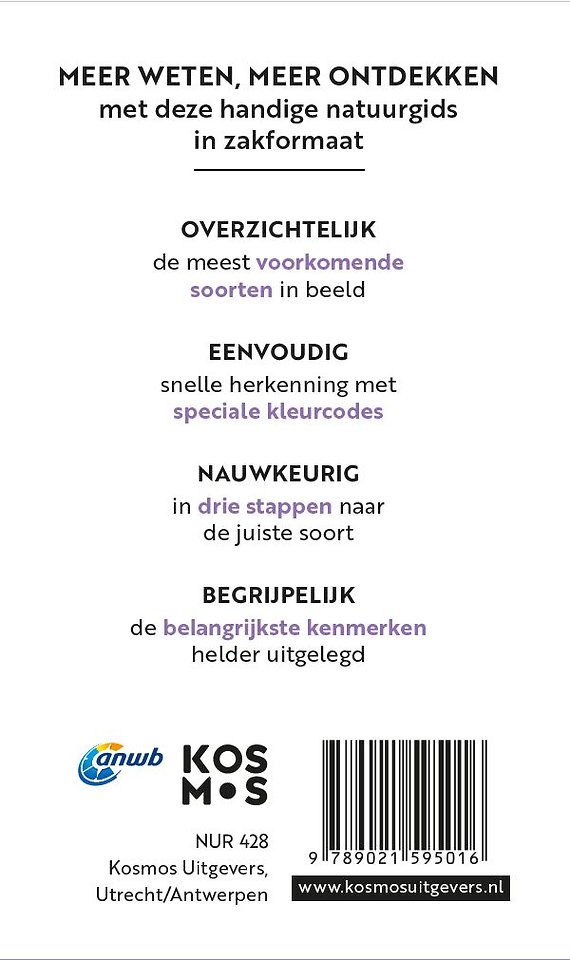 De ‘ANWB Basisnatuurgids – Bloemen’ is de perfecte gids voor iedere bloemenliefhebber. In deze zakgids komen ruim 150 wilde bloemen en planten aan bod. Door de prachtige foto’s en heldere beschrijvingen zie je in één oogopslag alle opvallende kenmerken, zoals groeihoogte, bloeiperiode en standplaats. De indeling op kleurcodes maakt het zoeken supereenvoudig. Door de pocketuitvoering is deze gids makkelijk mee te nemen tijdens elke natuurwandeling. Kortom, een handzaam formaat met een complete inhoud; ideaal voor een snelle en eenvoudige soortherkenning!