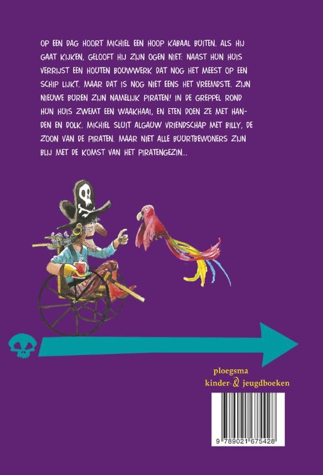 Op een dag hoort Michiel een hoop kabaal buiten. Als hij gaat kijken, gelooft hij zijn ogen niet: naast hun huis verrijst een houten bouwwerk dat nog het meest op een schip lijkt. Maar dat is nog niet eens het vreemdste. Zijn nieuwe buren zijn namelijk piraten! In de greppel rond hun huis zwemt een waakhaai, en eten doen ze met handen en dolk.