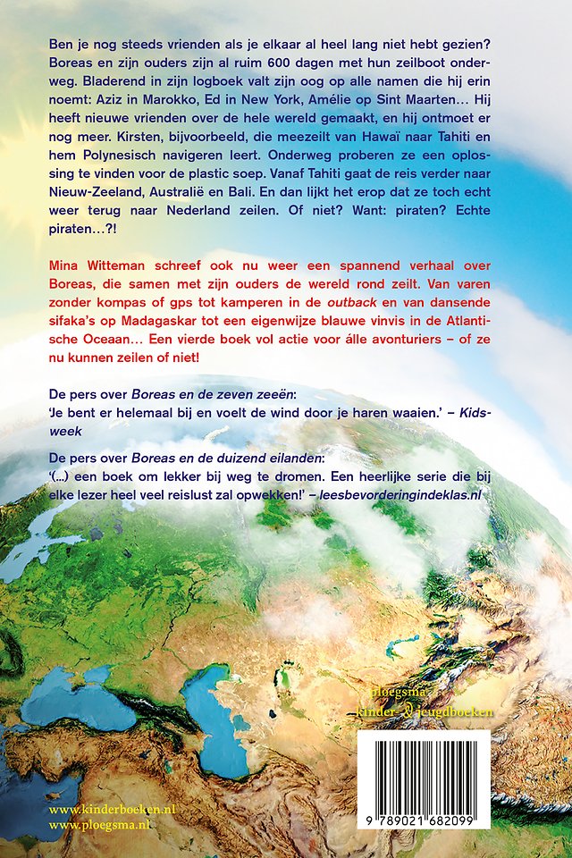 Boreas wordt ineens overspoeld door heimwee. Hij mist zijn vrienden, die nu allemaal in de brugklas zitten. Bladerend in zijn logboek valt zijn oog op alle namen die hij erin noemt: Mel op Sark, Aziz in Marokko, Isi op La Gomera… Hij heeft vrienden over de hele wereld, en hij ontmoet er nog meer. Kirsten, bijvoorbeeld, die meezeilt van Hawaii naar Tahiti en hem Polynesisch navigeren leert. Onderweg proberen ze een oplossing te vinden voor de plastic soep. Vanaf Tahiti gaat de reis naar Nieuw-Zeeland, Australië en Bali. En dan lijkt het erop dat ze toch echt weer terug naar Nederland zeilen. Of niet? Want: piraten? Echte piraten…?!