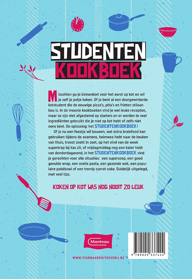 Misschien ga je binnenkort voor het eerst op kot en wil je zelf je potje koken. Of je bent al een doorgewinterde kotstudent die de eeuwige pizza’s, pita’s en frieten stilaan beu is. In de meeste kookboeken vind je wel leuke recepten, maar ze zijn niet afgestemd op starters en er worden te veel ingrediënten gebruikt die je niet op kot hebt of zelfs niet eens kent. De oplossing: het Studentenkookboek!Of je nu een feestje wil bouwen, wat extra brainfood kan gebruiken tijdens de examens, heimwee hebt naar de keuken van thuis, troost zoekt in zoet, op het eind van de week super krap bij kas zit, of vrijdagmiddag nog een kater hebt van donderdagavond, in het Studentenkookboek vind je gerechten voor alle situaties: een supersoep, een goed gevulde wrap, een snelle pasta, een gezonde wok, een populaire pokébowl of een trendy carrot cake. Duidelijk uitgelegd, met veel tips.