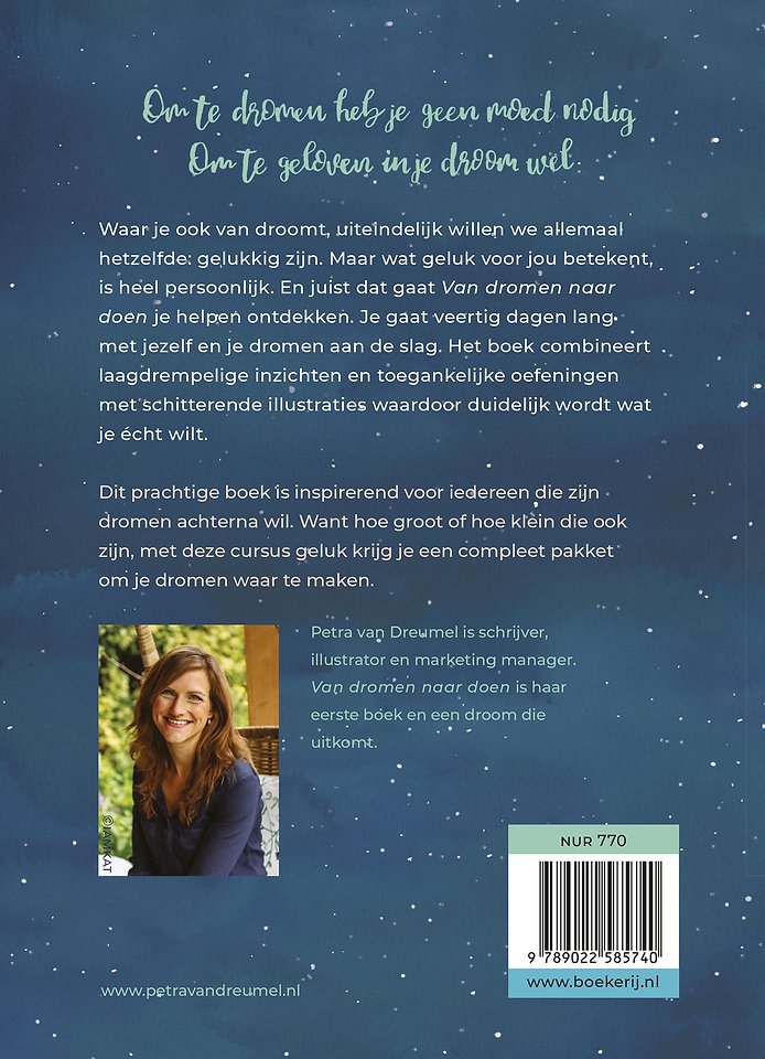Toen Petra van Dreumel zich ging bezighouden met haar eigen dromen, merkte ze hoe krachtig dit proces voor haar was: en misschien zou het anderen ook kunnen stimuleren! Ze stuurde daarom een aantal vriendinnen haar dagelijkse oefeningen door. Inmiddels zijn haar tips omgevormd tot een prachtig (cadeau)boek dat voor iedereen die zijn dromen achterna wil inspirerend is. Want hoe groot of hoe klein die ook zijn, Petra geeft je met deze cursus geluk een compleet pakket om je dromen waar te maken.