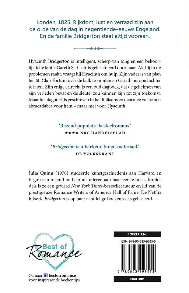 Hyacinth Bridgerton is intelligent, scherp van tong en een behoorlijk felle tante. Gareth St. Clair is gefascineerd door haar. Als hij in de problemen raakt, vraagt hij Hyacinth om hulp. Zijn vader is van plan het St. Clair-fortuin over de balk te smijten en Gareth staat machteloos. Het enige aanknopingspunt dat hij heeft, zou te maken kunnen hebben met een oud dagboek. Dat is geschreven in het Italiaans en is daarmee -volkomen abracadabra voor hem – maar niet voor Hyacinth.