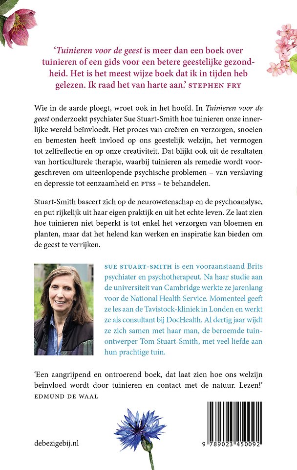 Wie in de aarde wroet, ploegt ook in het hoofd. In Tuinieren voor de geest onderzoekt psychiater Sue Stuart-Smith hoe tuinieren onze innerlijke wereld beïnvloedt. Het proces van creëren en verzorgen, van snoeien en bemesten heeft invloed op ons geestelijk welzijn, het vermogen tot zelfreflectie en op onze creativiteit. Dat blijkt ook uit resultaten van horticulturele therapie, waarbij tuinieren als remedie wordt voorgeschreven om uiteenlopende psychische problemen - van verslaving en depressie tot eenzaamheid en PTSS - te behandelen.
