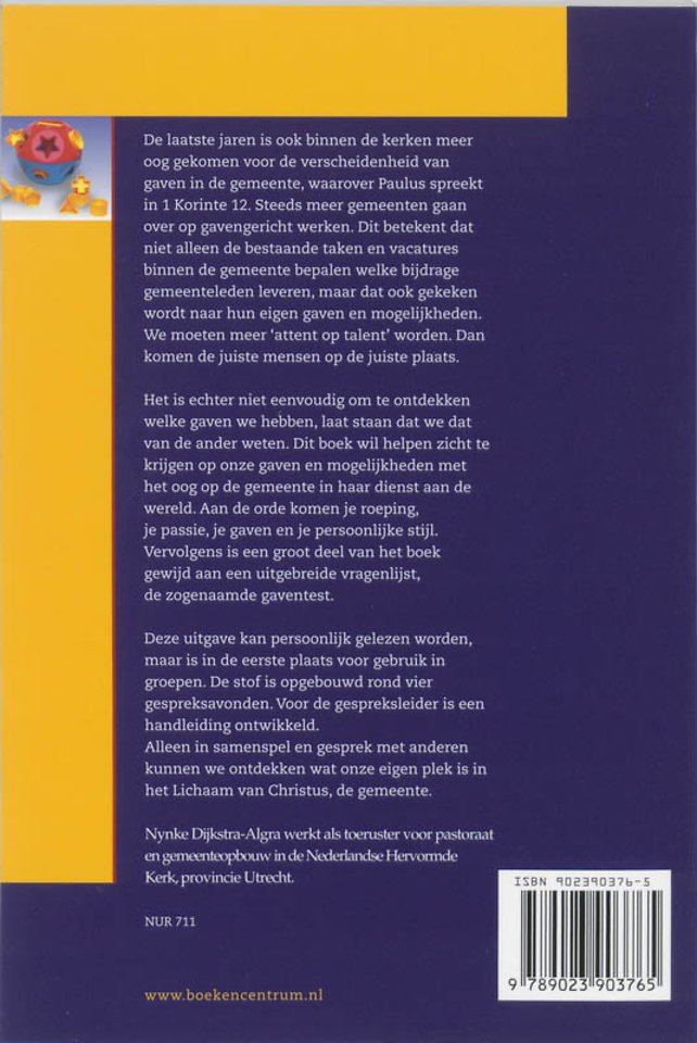 Het is echter niet eenvoudig om te ontdekken welke gaven we hebben, laat staan dat we dat van de ander weten. Dit boek wil helpen zicht te krijgen op onze gaven en mogelijkheden met het oog op de gemeente in haar dienst aan de wereld. Aan de orde komen uw roeping, uw passie, uw gaven en uw persoonlijke stijl. Vervolgens is een groot deel van het boek gewijd aan een uitgebreide vragenlijst, de zogenaamde gaventest.