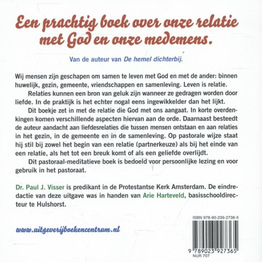 Wij mensen zijn geschapen om samen te leven met God en met de ander: binnen huwelijk, gezin, gemeente, vriendschappen en samenleving. Leven is relatie. Relaties kunnen een bron van geluk zijn wanneer ze gedragen worden door liefde. In de praktijk is het echter nogal eens ingewikkelder dan het lijkt. Dit boekje zet in met de relatie die God met ons aangaat. In korte overdenkingen komen verschillende aspecten hiervan aan de orde. Daarnaast besteedt de auteur aandacht aan liefdesrelaties die tussen mensen ontstaan en aan relaties in het gezin, in de gemeente en in de samenleving. Op pastorale wijze staat hij stil bij zowel het begin van een relatie (partnerkeuze) als bij het einde van een relatie, als het tot een breuk komt of als een geliefde overlijdt. Dit pastoraal-meditatieve boek is bedoeld voor persoonlijke lezing en voor gebruik in het pastoraat.