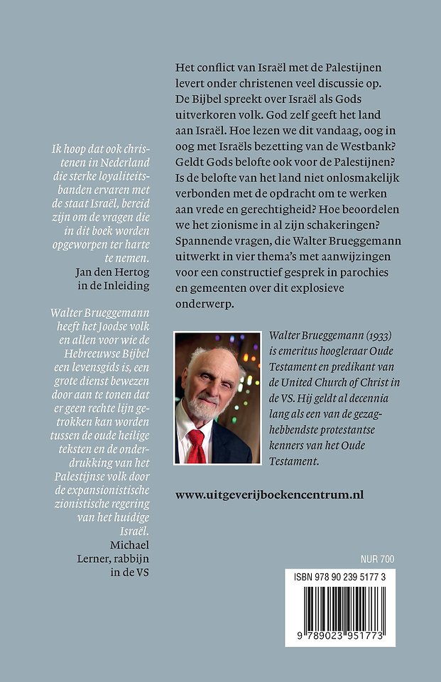 Oudtestamenticus Walter Brueggemann stelt indringende vragen bij de complexe relatie tussen het Israël uit de Bijbel en het Israël van nu. Hij werkt dit uit in vier thema's: het Israëlisch-Palestijns conflict, de relatie tussen de huidige Israëli's en het bijbelse uitverkoren volk, de landbelofte aan Mozes, en het zionisme. Bij elk thema zijn gespreksvragen opgenomen, zodat parochies en gemeenten dit explosieve thema vreedzaam en constructief aan de orde kunnen stellen.