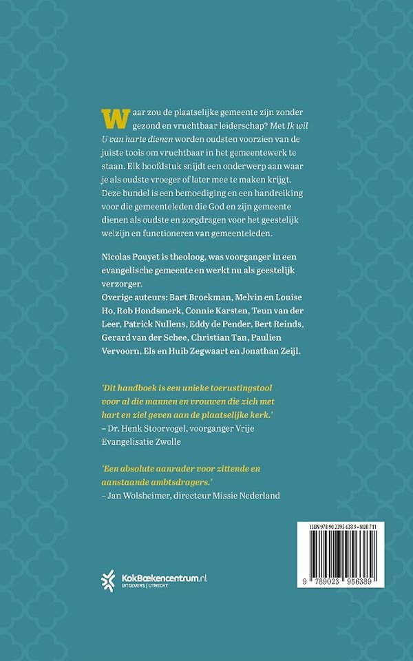 Ik wil U van harte dienen is een handboek voor oudsten in de kerk. Onder andere Nicolas Pouyet (red.), Gerard van der Schee en Paulien Vervoorn voorzien oudsten van de juiste tools om vruchtbaar in het gemeentewerk te staan. Want waar zou de plaatselijke gemeente zijn zonder gezond en vruchtbaar leiderschap? Elk hoofdstuk snijdt een onderwerp aan waar je als oudste vroeger of later mee te maken krijgt. Deze bundel is een bemoediging en een handreiking voor die gemeenteleden die God en zijn gemeente dienen als oudste en zorgdragen voor het geestelijk welzijn en functioneren van gemeenteleden.